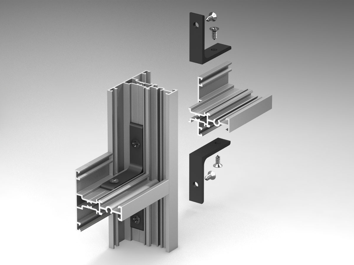 Сборка угловых соединений выполняется запрессовкой сухарей, вставляемых во внутренние камеры профилей. Возможно также крепление угловых закладных при помощи штифтов. Все закладные изделия устанавливаются на одно- или двухкомпонентный клей. Применение клея гарантирует жесткость и герметичность соединений. Импостовое соединение выполняется как на шурупах, так и на закладных сухарях методом заштифтовки или крепления на самонарезные винты.